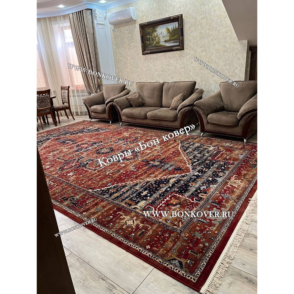 Качественный ковер с классическим рисунком. В моем случае идеально вписывается в интерьер комнаты, для которой его заказывала. Полностью соответствует всем указанным в описании характеристикам. Чистится просто, особо загрязненные участки без труда вычищаю при помощи специального средства для ковров ..